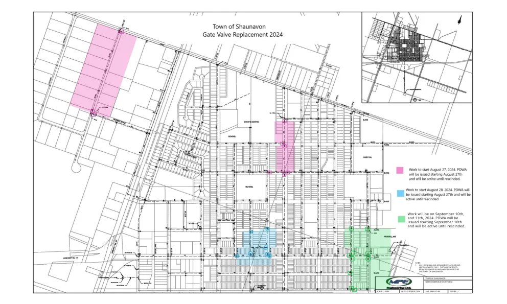 Please note that the Town of Shaunavon is continuing its Gate Valve Replacement Program during the following dates and locations outlined below and in the map attached: August 27th, 2024 - AFFECTED LOCATIONS: PINK